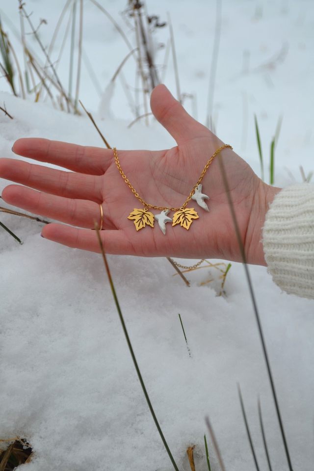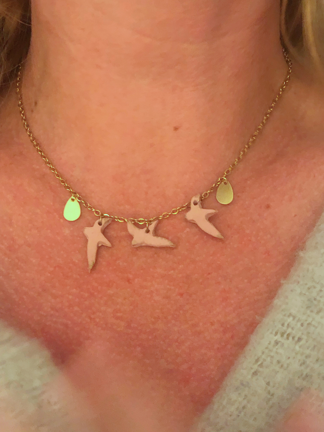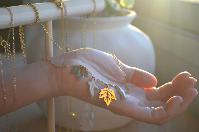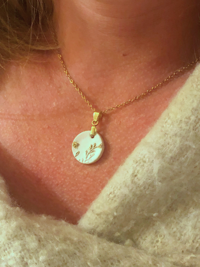 Une touche de peinture dorée sublime chaque création. Elle s’inspire de l’art japonais du Kintsugi, qui célèbre les fêlures et les rend plus précieuses encore. Comme lui, ce collier porte l’idée que nos émotions, nos épreuves et nos cicatrices ne nous brisent pas : elles nous transforment.